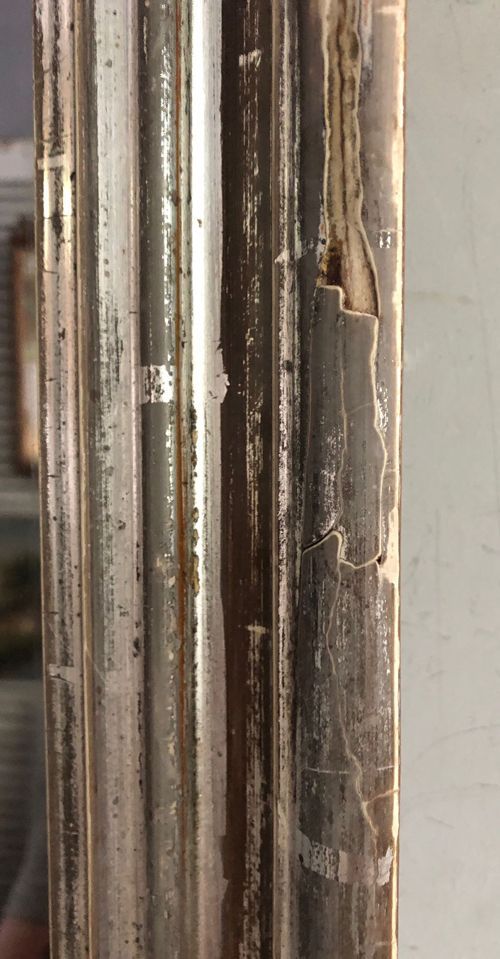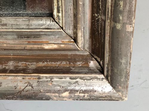 Ref 8109 - Antique French Mirror - Period Louis Philippe antique dressing mirror finished in original worn silver on black and brown bole. Some small areas of missing gesso to frame. Original mercury glass with sparkly edge to bottom of plate. Original board back. Circa 1840.