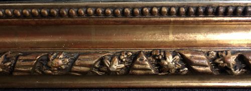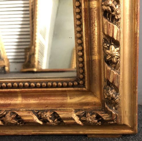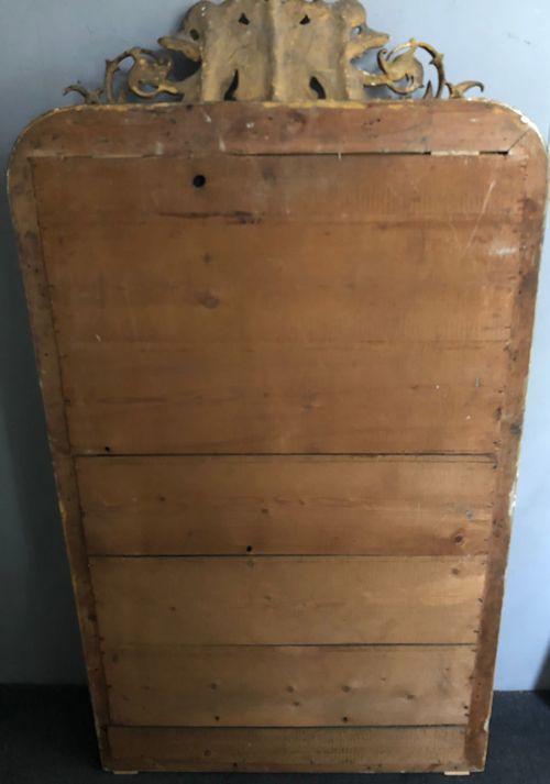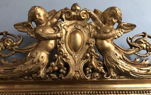 Ref 8114 - Antique French Mirror - Cherub crested antique mirror with gesso decoration to frame. Finished in two tone gilt worn through to red bole in places. Original glass. Original pine board back. Circa 1880.