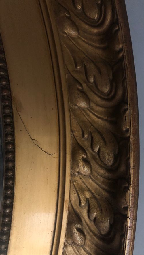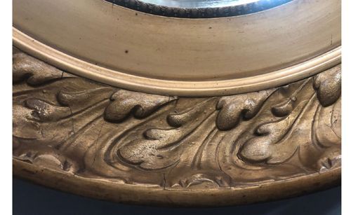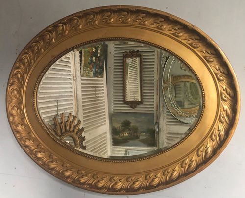 Ref 8126 - Antique French Mirror - Gilt antique oval mirror with gesso decoration. Landscape/portrait. Some non-structural shrinkage cracks to frame. Original bevelled glass. Original thin veneer back. Circa 1900.