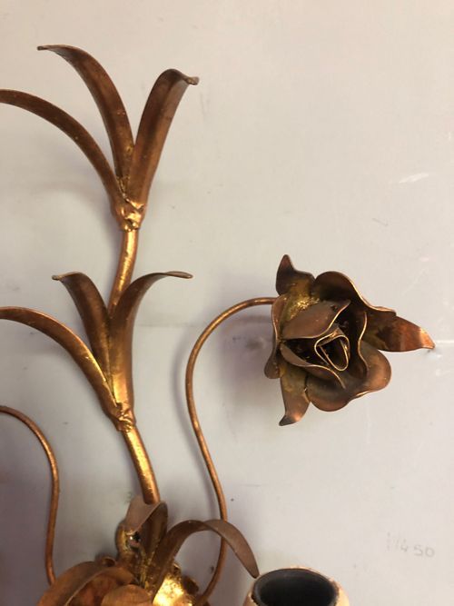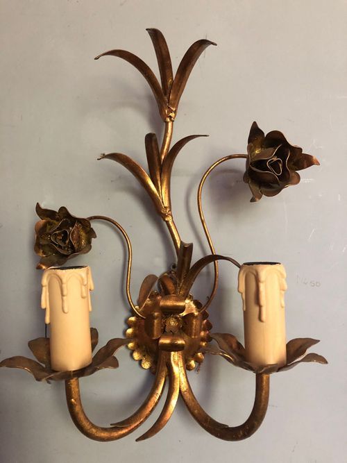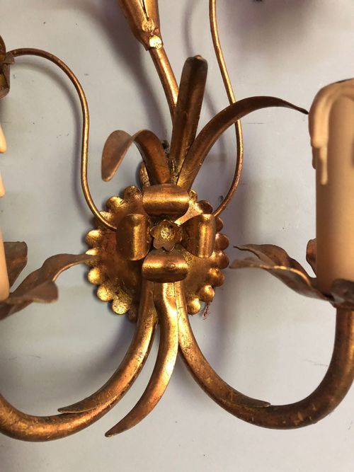 Ref 8131 - Pair of two arm French gilt painted metal wall lights with flower and leaf decoration. Working wiring and bulb holders (need checking). Circa 1950.