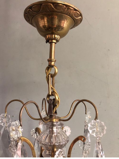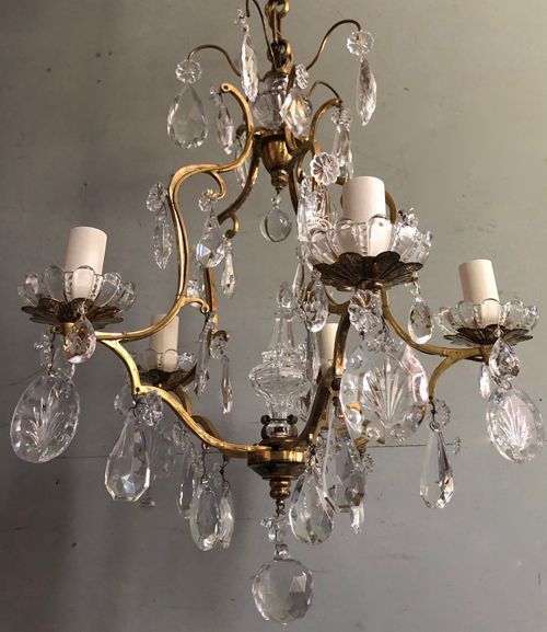 Ref 8132 - French 5 arm brass chandelier with original clear crystals. Recently cleaned and rewired. Original ceiling rose and brass chain. Circa 1930.