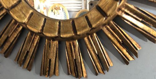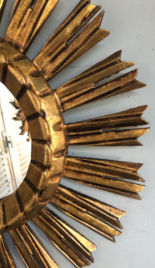 Ref 8138 - Carved giltwood sunburst mirror with original glass. Circa 1950.