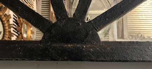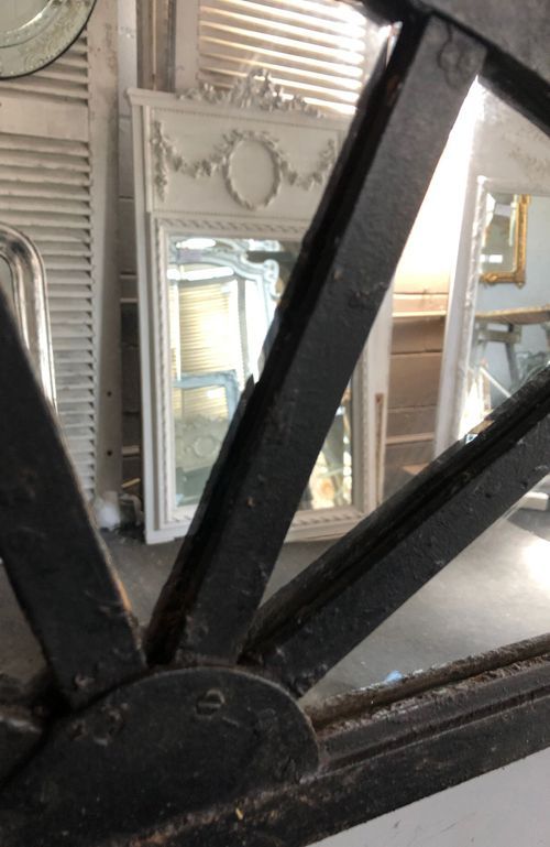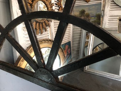 Ref 8142 - 19th Century cast iron demi lune window fitted with new mirror glass. Finished in old worn black paint. Painted plywood back. Circa 1880.