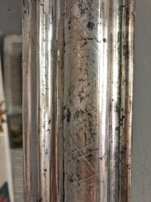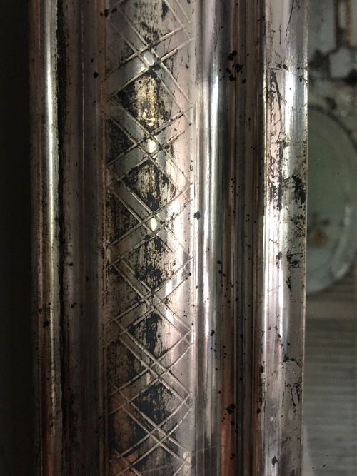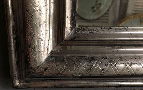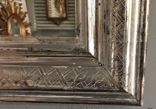 Ref 8144 - Antique French Mirror - Silver on black Louis Philippe antique mirror with cross hatch etching to frame. Original lightly patinated glass. Original pine board back. Circa 1880.