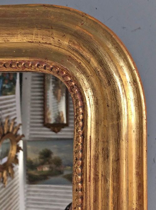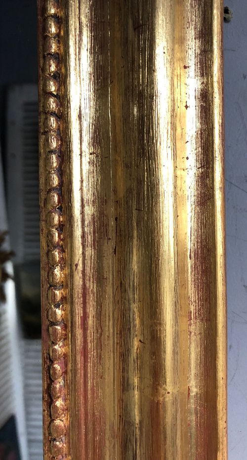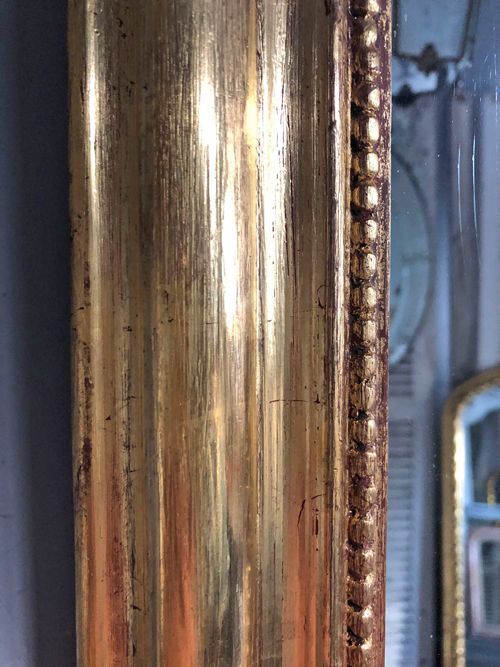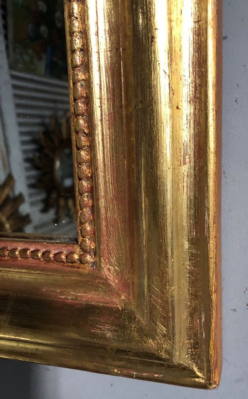 Ref 8145 - Antique French Mirror - Gilt on red Louis Philippe antique mirror. Original glass. Original pine board back. Glass dated 1881.