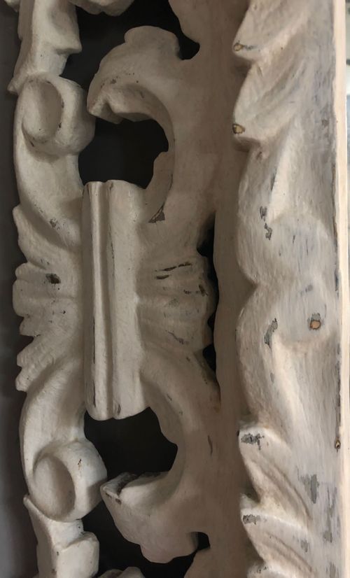 Ref 8166 - Antique French Mirror - Carved wood worn off white painted Florentine antique mirror. Original bevelled glass. Original pine board back. Circa 1890.