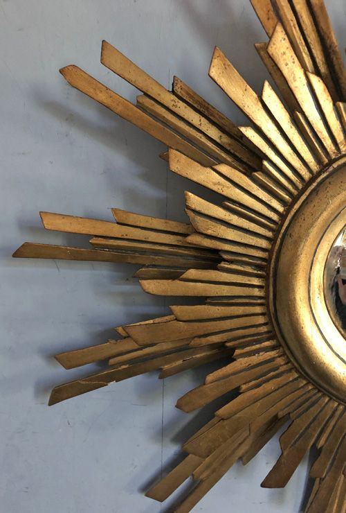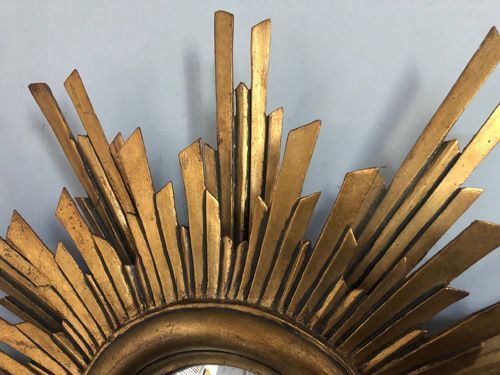 Ref 8172 - Carved giltwood double ray sunburst mirror with original convex glass. Circa 1950.