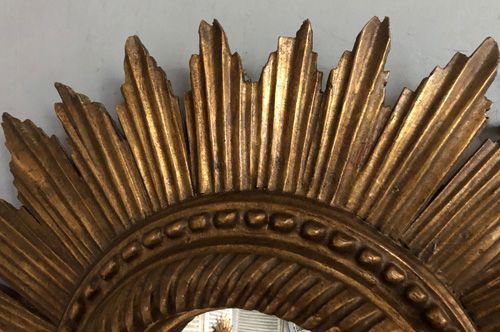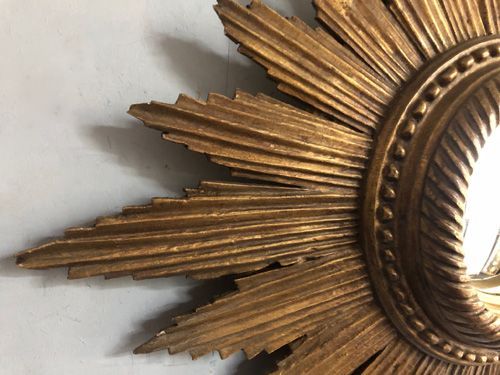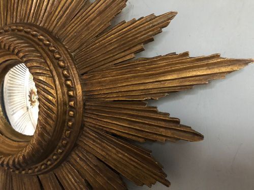 Ref 8175 - Carved giltwood sunburst mirror with original convex glass. Circa 1950.
