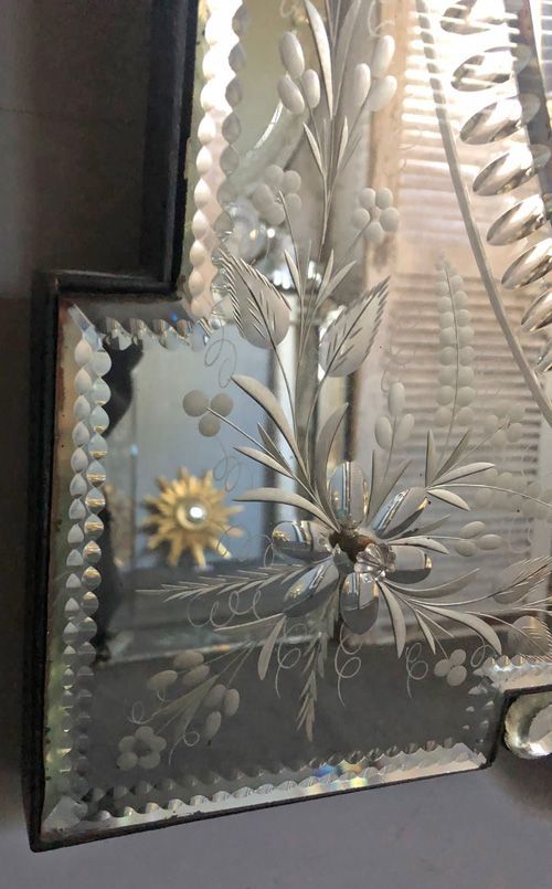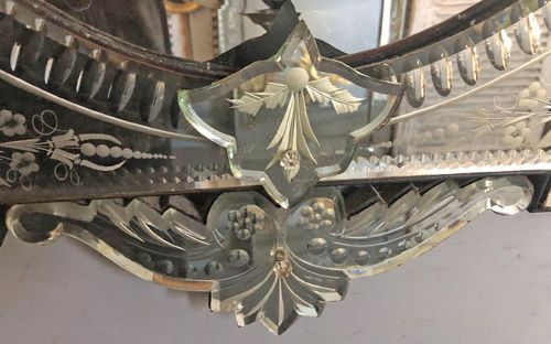 Ref 8184 - Antique Venetian Mirror - 19th century double crested antique Venetian mirror with reverse etched decoration to crest and outer frame. Original glass with bevelled oval centre plate. Original pine board back. Circa 1880.