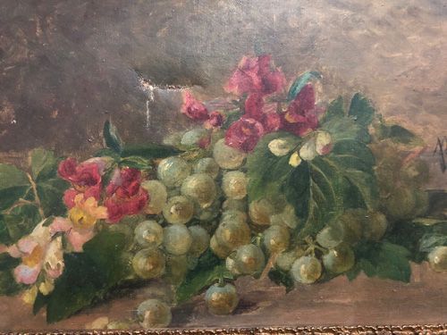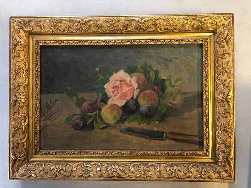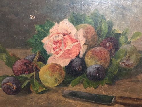 Ref 8187 - Pair of 19th Century antique French oil on canvas still life paintings in original gilt frames. Original wooden stretchers. One patched tear to canvas and one small area of lost paint showing canvas threads. Unrestored. Signed B.Malin. Circa 1880.