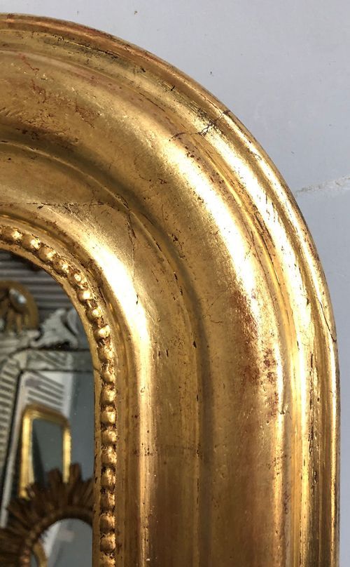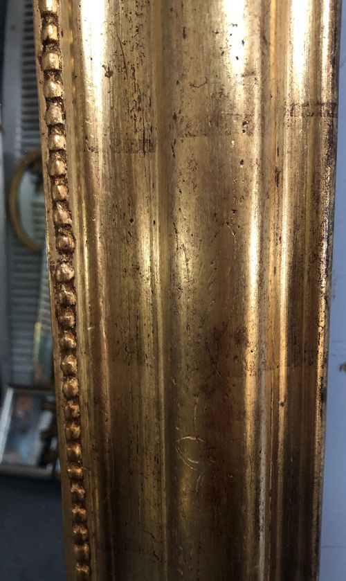 Ref 8189 - Antique French Mirror - Gilt Louis Philippe antique mirror. Gilt on red worn through to red bole in places. Original glass dated 1885. Later plywood back.