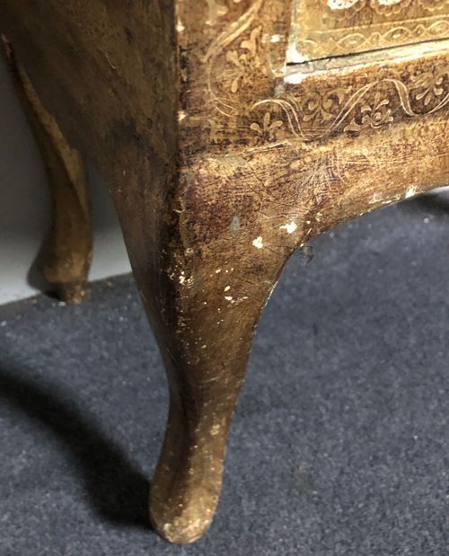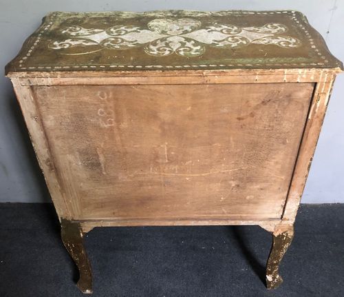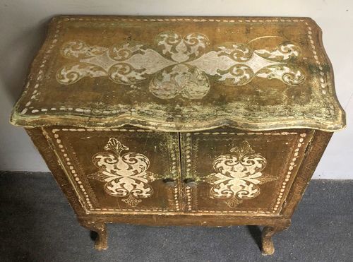 Ref 8190 - Vintage Italian cupboard finished in original worn embossed gilt and off white painted decoration. Circa 1950.