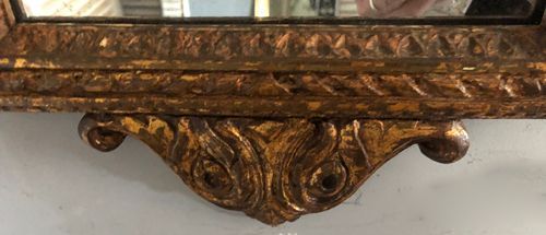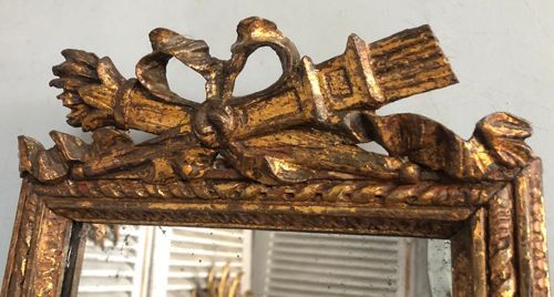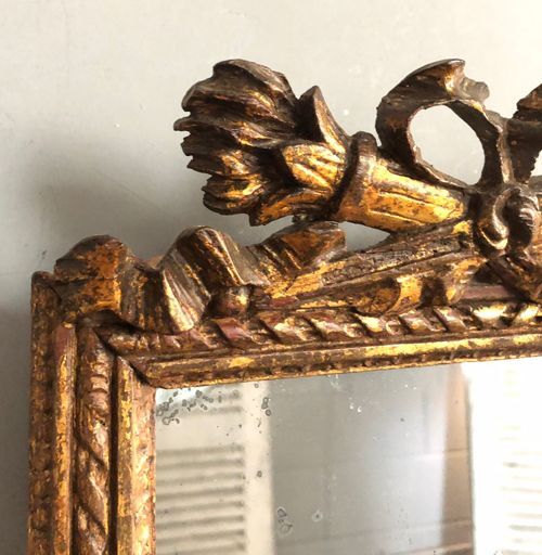 Ref 8195 - Antique French Mirror - Carved giltwood Louis XVI style double crested antique mirror finished in original worn gilt. Heavily patinated mercury glass. Original pine board back with faded Paris maker's stamp. Circa 1880.