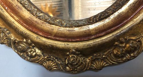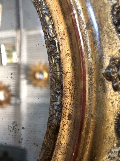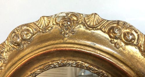 Ref 8197 - Antique French Mirror - Small gilt oval mirror with gesso decoration to frame. Finished in original two tone gilt on red. Mercury glass. Old pine board back. Circa 1850.