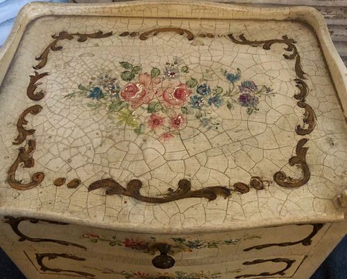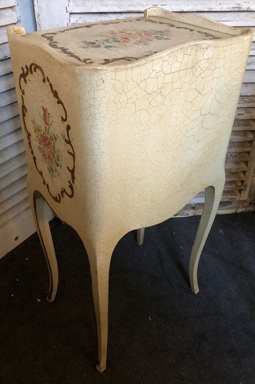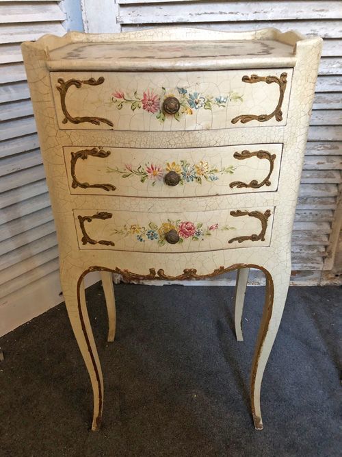Ref 8203- Pair of vintage Italian three drawer bedside cabinets with original off-white craquelure paint and original gilt painted raised decoration and worn painted flowers. Circa 1950.
