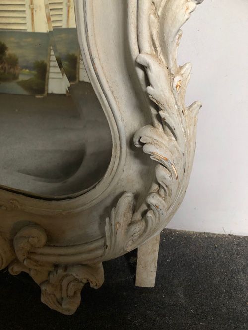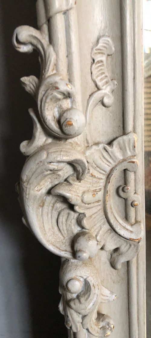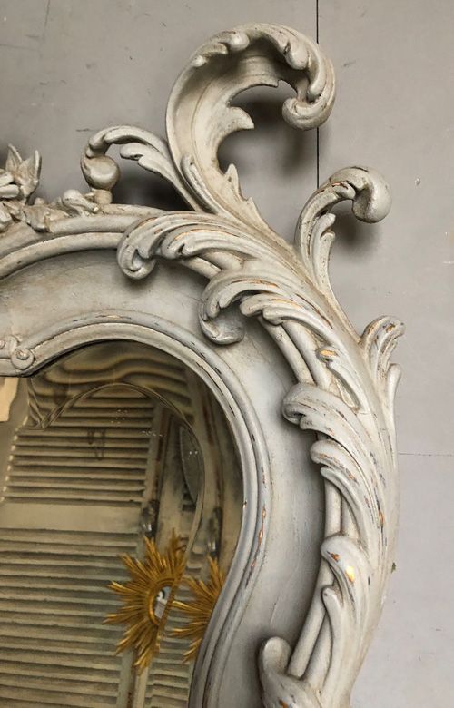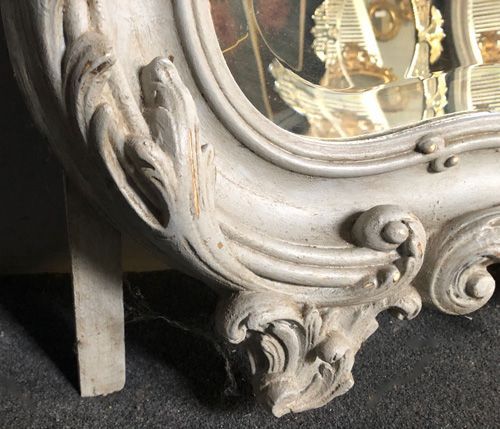 Ref 8210 - Antique French Mirror - Large worn grey painted crested Rococo antique mirror. Original bevelled glass with some small black spots. Original pine board back. Circa 1890.