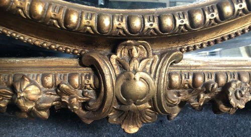 Ref 8212 - Antique French Mirror - Napoleon III crested margin mirror with oval centre plate and gesso decoration to frame. Finished in dark patinated two tone gilt worn through to red bole in places. Original bevelled glass. Original thick pine board back. Circa 1870.
