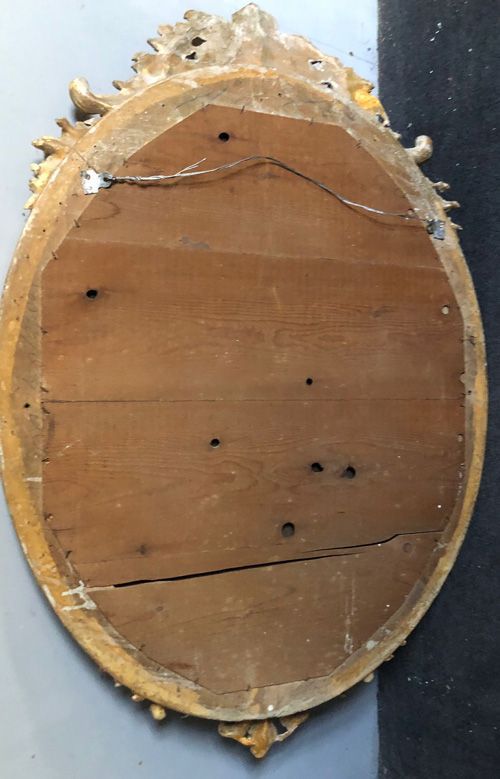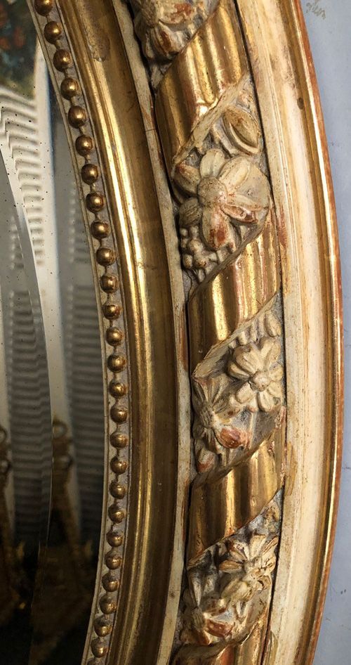Ref 8213 - Antique French Mirror - Large double crested Napoleon III antique oval mirror with gesso decoration to frame. Finished in cream polished gesso with gilt on red highlights. Original bevelled glass with faint manufacturing wipe marks to back of plate. Original pine board back. Circa 1890.