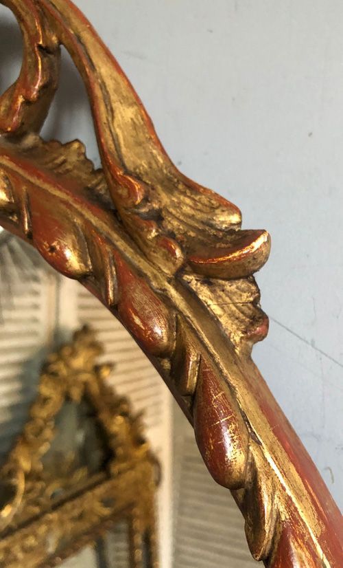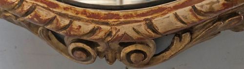 Ref 8220 - Antique French Mirror - Carved giltwood double crested antique oval mirror. Finished in original gilt worn through to red bole and white gesso in places. Original glass. Original pine board back. Circa 1900.
