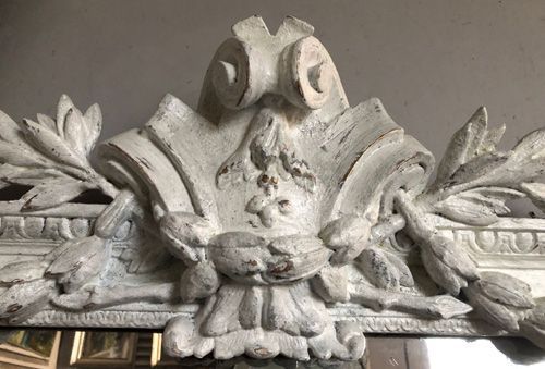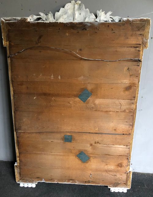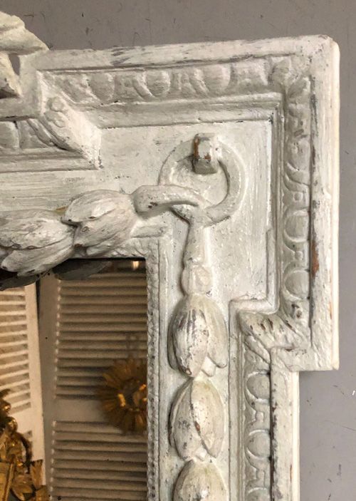 Ref 8225 - Antique French Mirror - Worn pale grey painted Napoleon III period crested antique mirror with gesso decoration to frame. Original sparkly mercury glass. Original pine board back. Circa 1850.