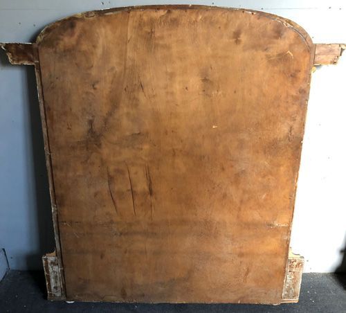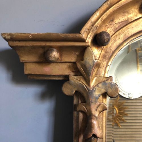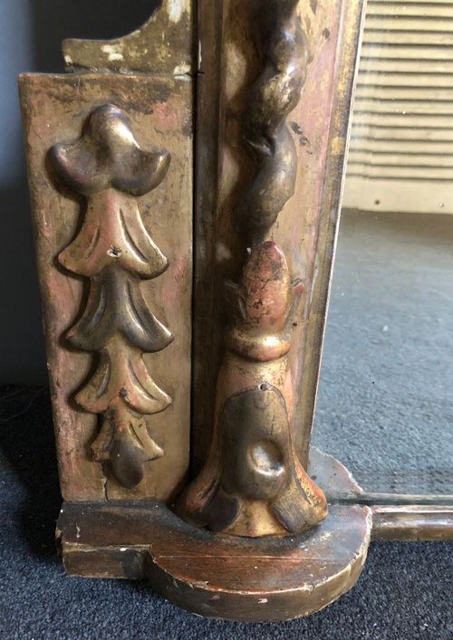 Ref 8228 - Carved giltwood English antique overmantle mirror. Finished in original worn and patinated two tone gilt on red and black bole worn through to wood and bole in places. Original white porcelain bun feet. Some non- structural shrinkage cracks to frame. Old replaced bevelled glass and back. Circa 1840.