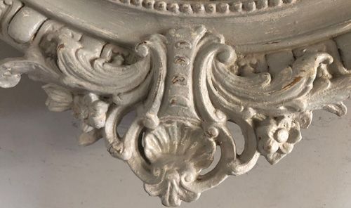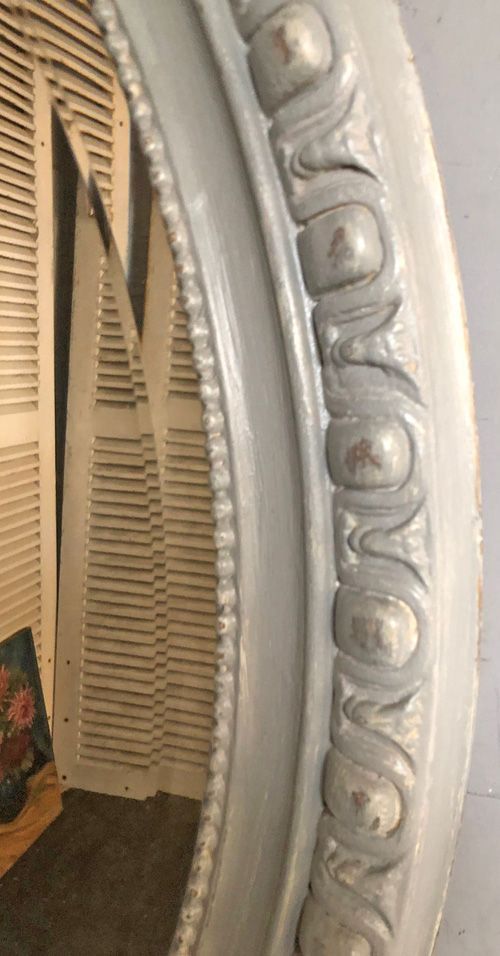 Ref 8229 - Antique French Mirror - Large worn grey painted Napoleon III double crested oval mirror with gesso decoration to frame. Original bevelled glass. Original pine board back. Circa 1870.