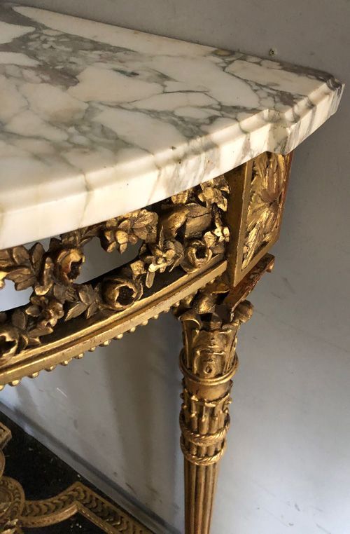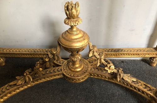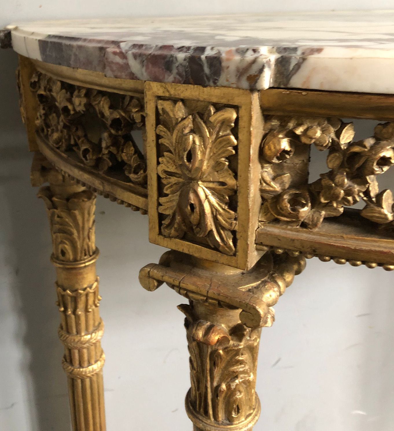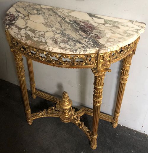 Ref 8236 - Carved giltwood Louis XV style demi-lune antique French console table. Finished in original two tone gilt on red. Original shaped marble top. Circa 1880.