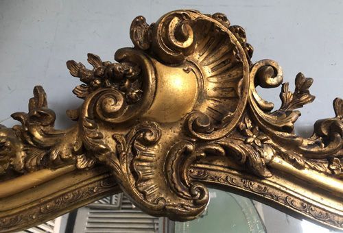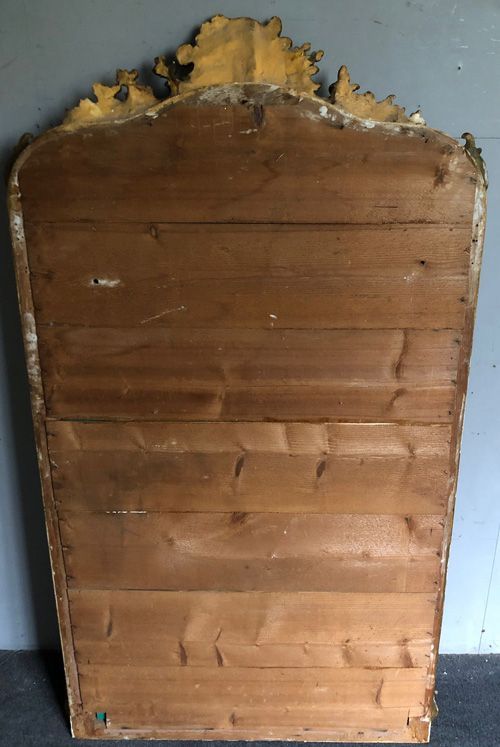 Ref 8248 - Antique French Mirror - Gilt camel crested Louis XV antique mirror with gesso decoration to frame. Finished in original mellow two tone gilt on red. New glass. Original pine board back. Circa 1890.