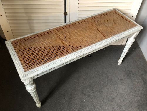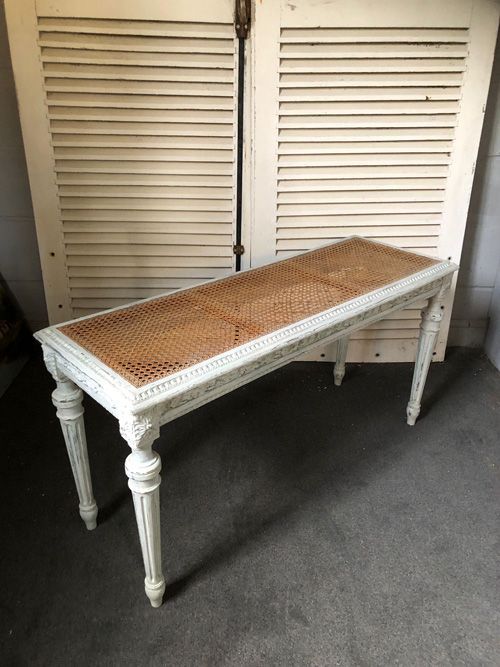 Ref 8252 - Worn pale grey over dark grey painted antique French carved wood stool with cane panel top. Circa 1900.