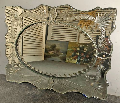 Ref 8253 - Antique Venetian Mirror - Antique Venetian mirror with etched decoration to outer margins. Original glass with scalloped bevel to centre plate. Old pine board back. Circa 1900.