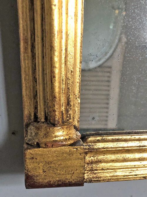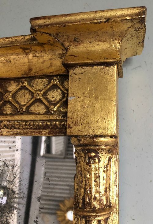 Ref 8255 - Late Regency period pier glass English antique mirror. Finished in gilt worn through to brown bole in places. Heavily patinated thin mercury glass (see close-ups). Thin pine board back. Circa 1820.