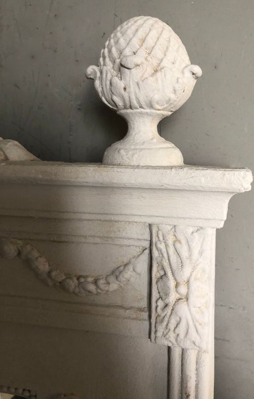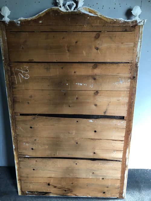 Ref 8260 - Antique French Mirror - Large worn off white painted garland crested antique mirror. Original bevelled glass with some small black patination spots. Original pine board back. Circa 1880.