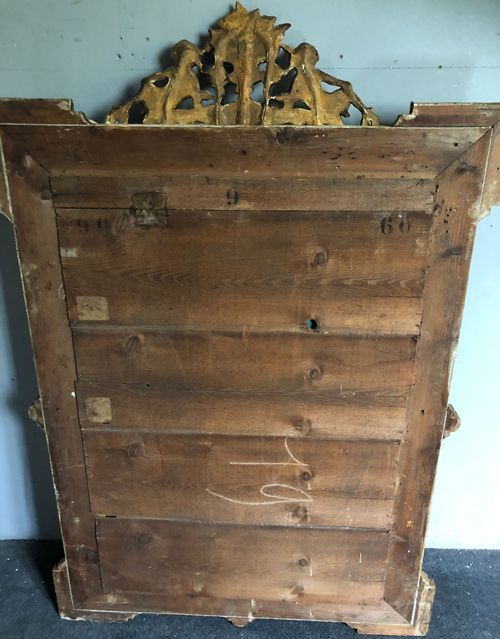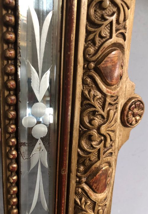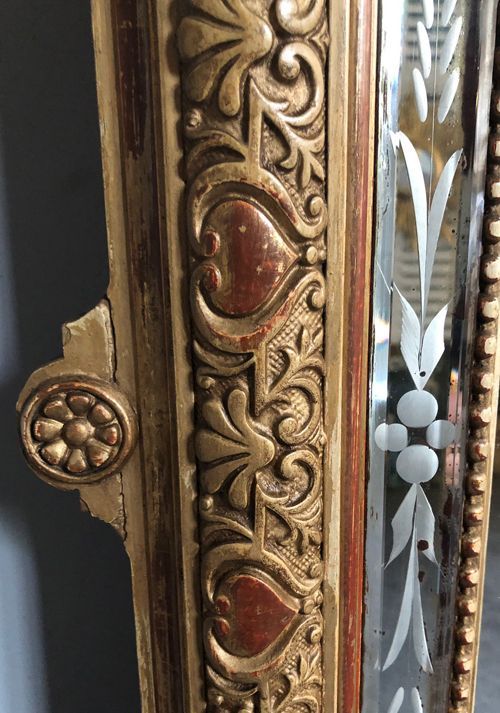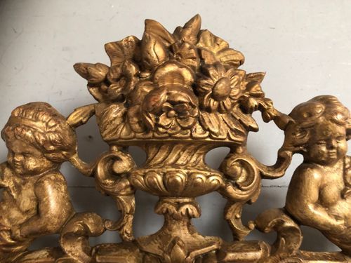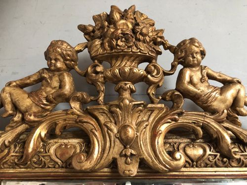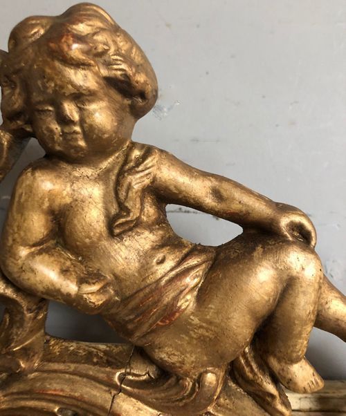 Ref 8264 - Antique French Mirror - Cherub crested antique French facet mirror with gesso decoration to frame. Finished in original two tone gilt, worn through to red bole and cream in places. New centre glass and original reverse etched facet glass to frame. Original pine board back. Circa 1880.
