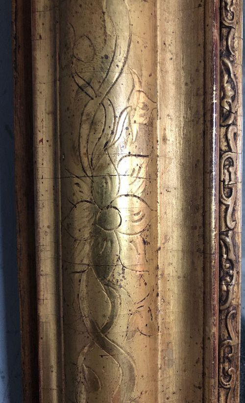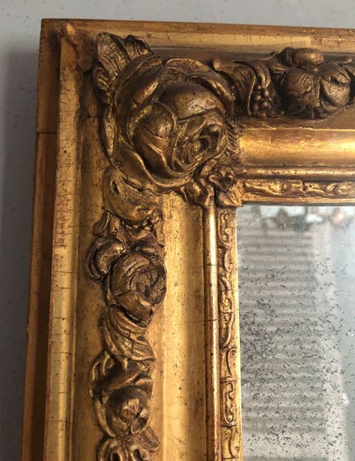 Ref 8267 - Antique French Mirror - Period gilt Restauration antique French mirror with gesso decoration and flower and leaf decoration to frame. Original patinated mercury glass. Old pine board inset back. Circa 1840.