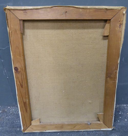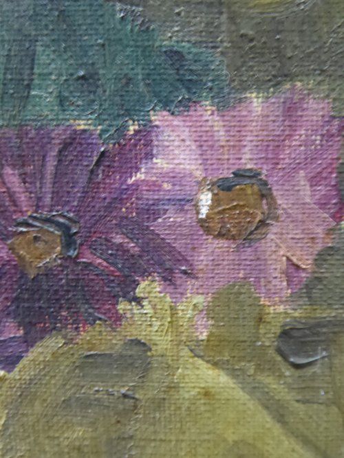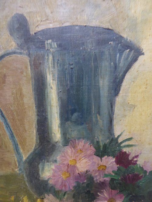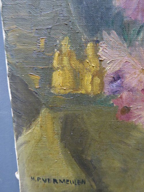 Ref 8280 - French oil on canvas still life of jug and flowers on original wooden stretcher. Signed by artist M.P. Vermeulen. Some very small flakes of missing paint. Circa 1950.